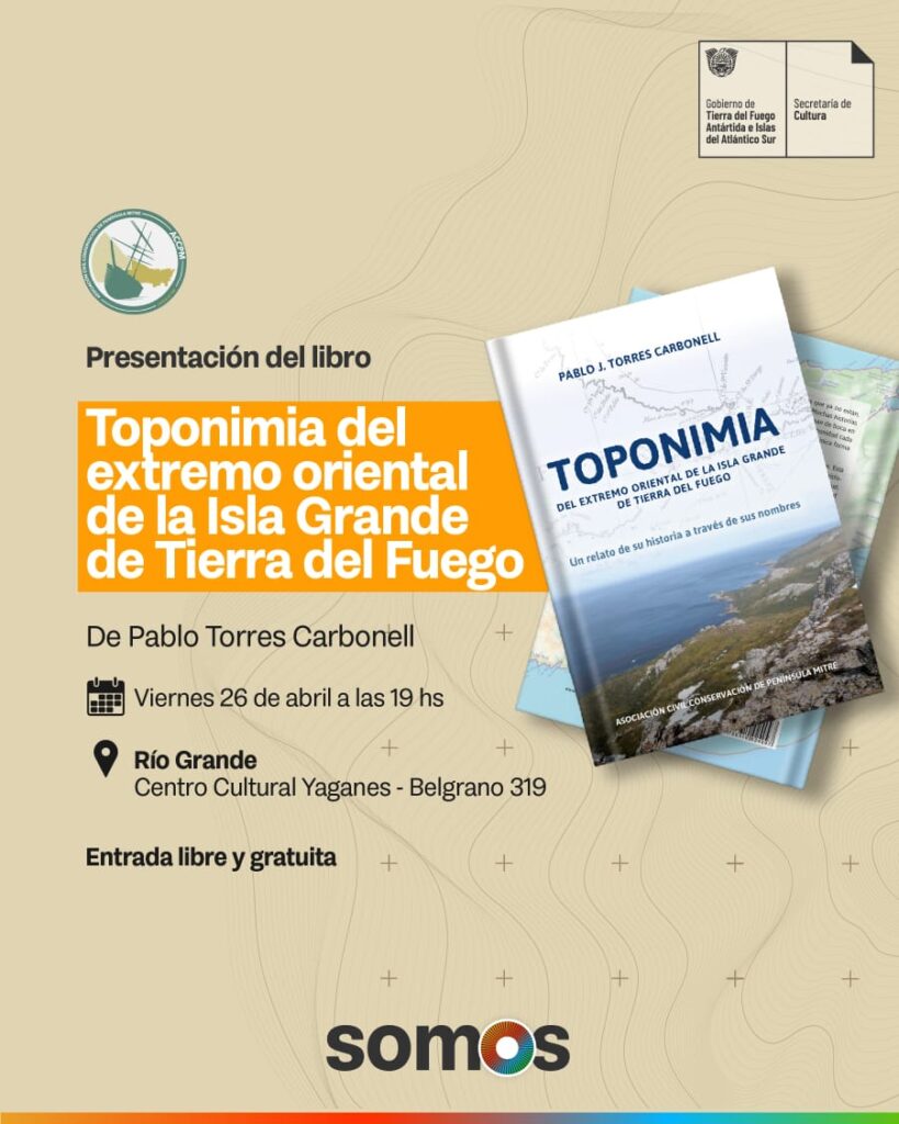 La Asociación Civil Conservación de Península Mitre invita a la presentación del libro “Toponimia del extremo oriental de la Isla Grande de Tierra del Fuego. Un relato de su historia a través de sus nombres” de Pablo Torres Carbonell. La cita es este viernes 26 de abril a las 19 horas en el Centro Cultural Yaganes (Belgrano 319) con entrada libre y gratuita.