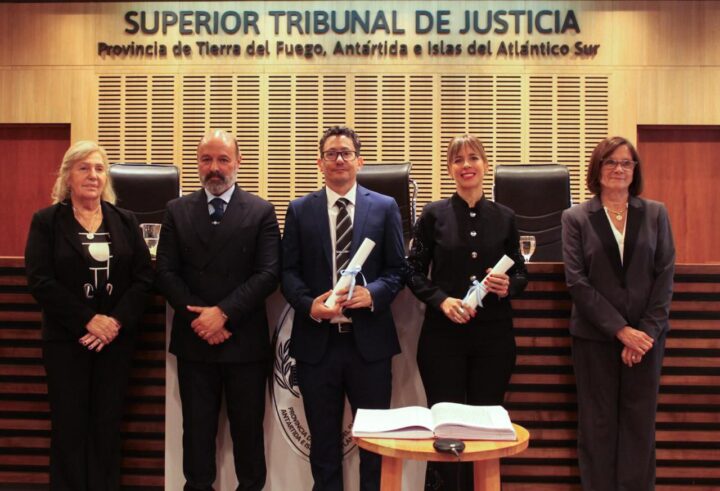 Ushuaia.- Los jueces del Superior Tribunal de Justicia, Dres. María del Carmen Battaini, Javier Darío Muchnik y Edith Miriam Cristiano, tomaron juramento este jueves 6 de marzo, al Dr. Sergio Pepe y a la Dra. Anahí Petrina.