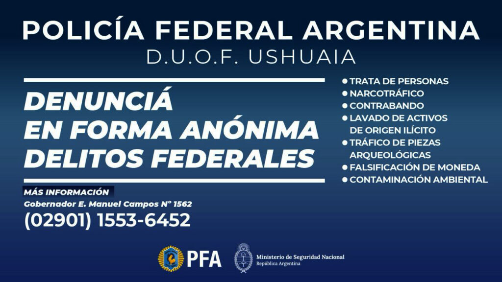 La División Unidad Operativa Federal (D.U.O.F.) Ushuaia de la Policía Federal Argentina lanzó una campaña para promover las denuncias anónimas de delitos federales. A través de una línea telefónica directa, los ciudadanos podrán informar hechos delictivos sin revelar su identidad.