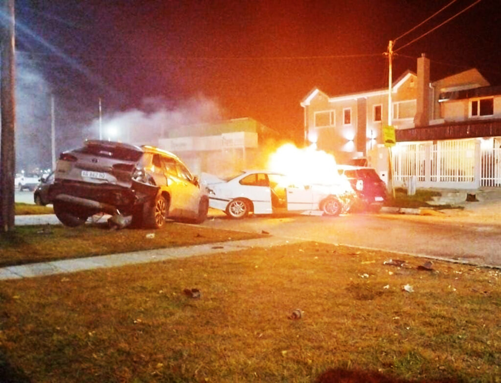 Un BMW 328, conducido por Sergio Nicolás Sager (30) acompañado por Matías Pereyra, que circulaba por calle Ushuaia al 60 casi Av. Santa Fe, perdió el control, e impactó contra autos estacionados. La parte delantera del BMW, terminó incendiándose. Los afectados fueron una Toyota Corolla Cross, que sufrió importantes daños en su parte trasera y laterales, y un Mini Cooper, ambos propiedad de Ana María Grao, de 68 años. Sager tenía alcohol en sangre.