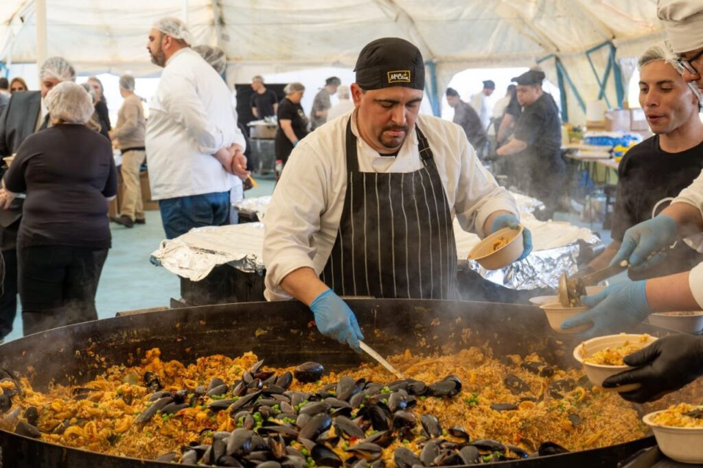 La paella estuvo a cargo de Gastronomía del Sur (GDS), empresa que desplegó un operativo de más de 100 profesionales y montó 15 paelleras —entre ellas, una versión vegetariana— para cocinar y servir las 15 mil porciones gratuitas destinadas a la comunidad. La entrega comenzó a las 14 horas y se extendió durante más de tres horas, en un clima de alegría y celebración compartida.