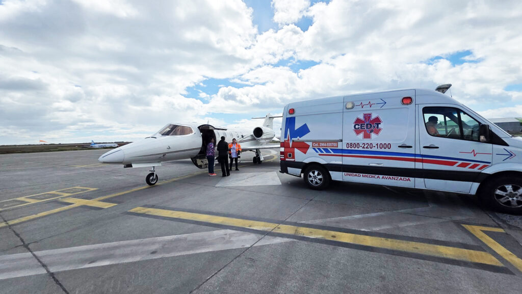 El operativo se realizó el 18 de diciembre mediante un trabajo articulado entre CEDyT, Aviajet S.A. y la Obra Social del Estado Fueguino, garantizando un traslado seguro y oportuno hacia un centro de mayor complejidad fuera de la provincia.