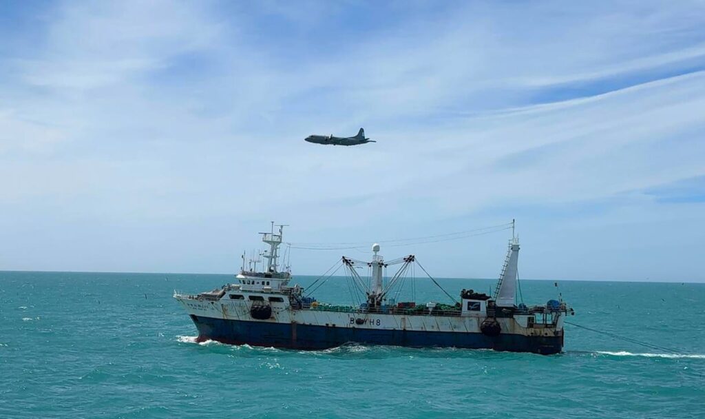 En paralelo a la acción del patrullero, la aeronave de vigilancia P-3 Orion ejecutó tareas de monitoreo de los espacios marítimos. Su función fue brindar sostén operativo al buque de superficie, realizando sobrevuelos del sector para recopilar la información y el material probatorio necesario para certificar la falta.