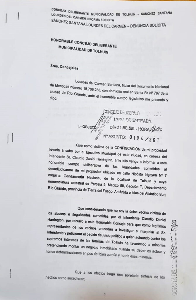 Tolhuin.- El Concejo Deliberante de Tolhuin recibió el pasado 21 de enero un pedido formal de juicio político contra el intendente municipal Daniel Harrington, impulsado por la vecina Lourdes del Carmen Sánchez Santana, quien denunció haber sido víctima de la “confiscación” de un inmueble de su propiedad por parte del Ejecutivo local.