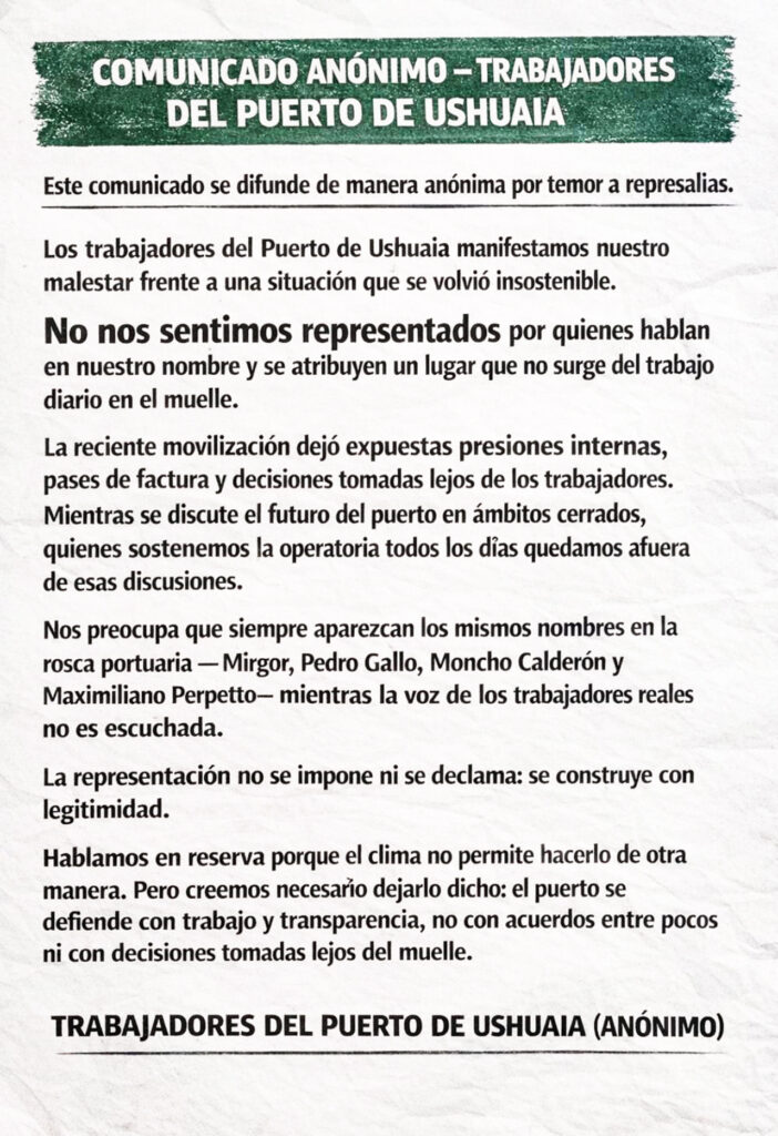 Ushuaia.- En medio del conflicto por la intervención y el reordenamiento institucional del Puerto de Ushuaia, un comunicado difundido de manera anónima por trabajadores del muelle volvió a encender las alarmas puertas adentro de la principal infraestructura logística de la provincia. El texto, breve pero contundente, denuncia un clima interno “insostenible”, marcado por presiones, pases de factura y decisiones tomadas lejos del ámbito donde se desarrolla el trabajo cotidiano.