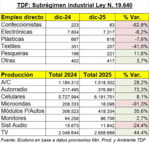 El informe destaca que la principal incidencia negativa provino del sector industrial, particularmente del complejo electrónico, donde se registró una caída de 252 puestos formales; así como tambien en el sector textil y confeccionista que vienen con pérdida de empleo desde 2022. Este retroceso explica una porción sustancial de la contracción total del empleo y vuelve a poner de relieve la sensibilidad del entramado manufacturero local frente a cambios en la demanda, niveles de producción, políticas de importación, disponibilidad de insumos y expectativas empresariales.