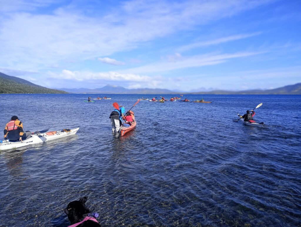 La salida tuvo lugar desde la cabecera del lago Yehuin —sector de la antigua hostería— desde donde los participantes bordearon la isla Guanaco hasta arribar al predio de Titín Vidal, donde se instaló el campamento para pasar la noche.