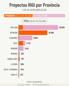San Juan lidera la radicación de los proyectos presentados al RIGI, con la minería como estandarte y USD 25.029 MM. Le siguen Río Negro, con el proyecto de GNL y USD 18.289 MM. Catamarca cierra el podio con USD 8.654 MM.