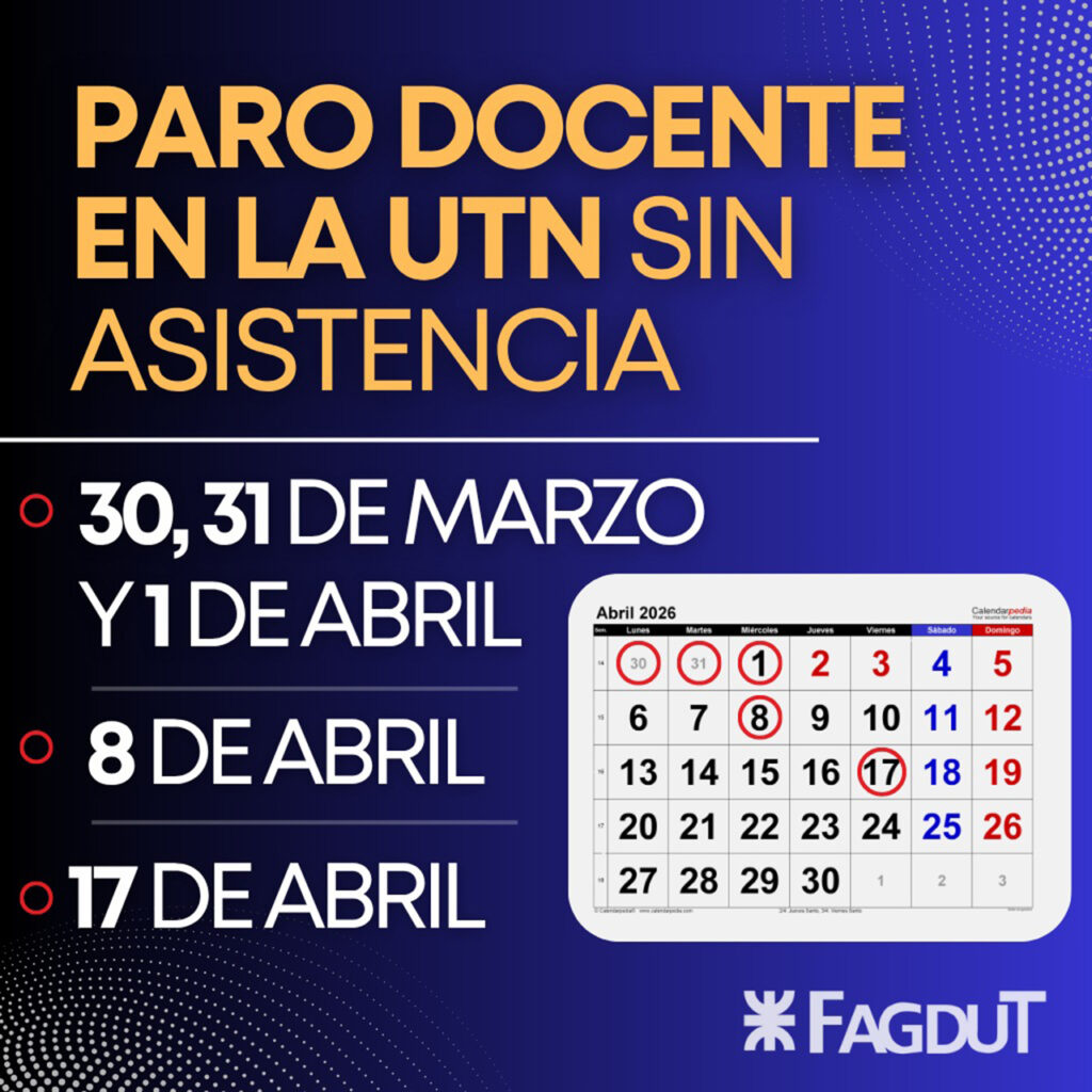 Río Grande.- En el marco de un conflicto que lejos de apaciguarse suma tensión semana tras semana, el presidente de la FAGDUT fueguina, el Lic, Fabio Seleme, confirmó un nuevo esquema de medidas de fuerza que contempla cinco jornadas de paro docente en la Universidad Tecnológica Nacional: los días 30 y 31 de marzo, 1, 8 y 17 de abril.