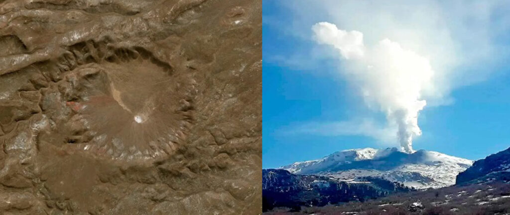 En el norte neuquino, el Domuyo —»el que tiembla y rezonga», según la memoria ancestral—, pico más alto de la Patagonia, continúa elevándose casi quince centímetros por año, recordándonos que la tierra respira y empuja desde abajo. El Domuyo no es una montaña concluida, sino un crecimiento en curso; un edificio que todavía se construye a sí mismo. Bajo sus laderas, el agua hierve: géiseres que irrumpen como escapes súbitos y fumarolas que exhalan vapores sulfurosos, como un animal pavoroso que aún no termina de despertar. Más al oeste, el Copahue confirma que el fuego no es recuerdo fósil sino presente activo: su cráter siempre inestable, su laguna ácida donde el calor se visibiliza en nieblas y resplandores, son la prueba de que el magma no es un contenido sellado sino una víscera viva que se retuerce en las profundidades y se replica en una constelación de campos volcánicos —mesetas basálticas, conos de retroarco y cráteres dispersos— que se extienden por toda la Patagonia, desde Pali-Aike hasta Basalto Cráter.