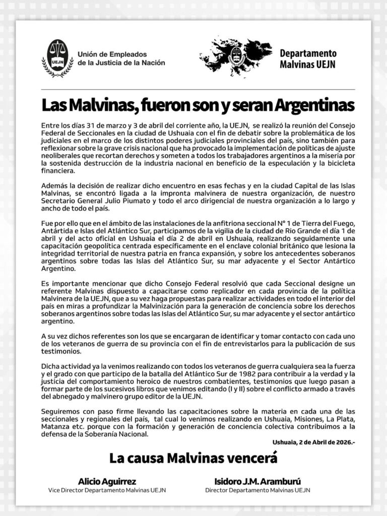 El dirigente sindical explicó que la UEJN desarrolló una intensa agenda en Tierra del Fuego entre el 1 y el 3 de abril, con participación en las vigilias de Río Grande y Ushuaia, así como en el acto oficial del 2 de abril en la capital provincial. En ese marco, también se realizó una capacitación sobre la situación del Atlántico Sur, Malvinas, Antártida y el escenario geopolítico internacional.